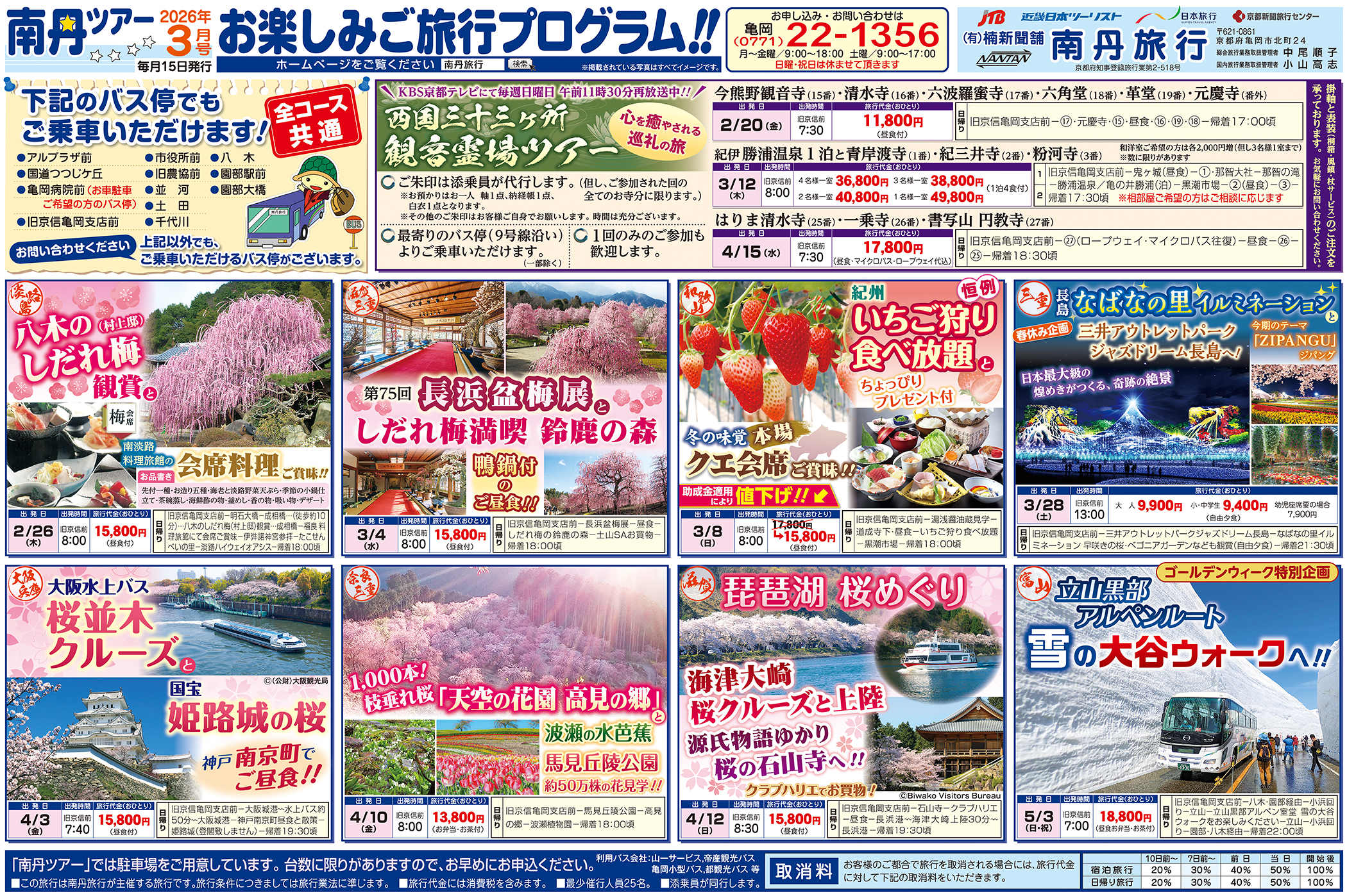 亀岡・八木・園部出発の観光バスツアー 日帰り 宿泊 季節に合ったおすすめバスツアーです。